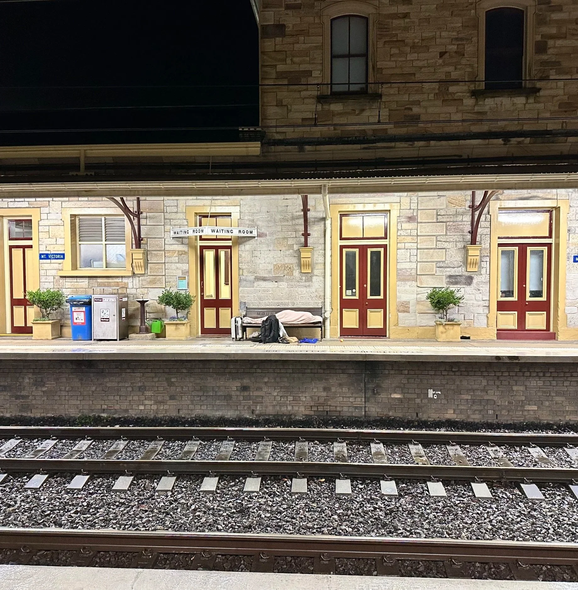 Person having a sleep at the Mt Victoria Train Station. Cozy station?